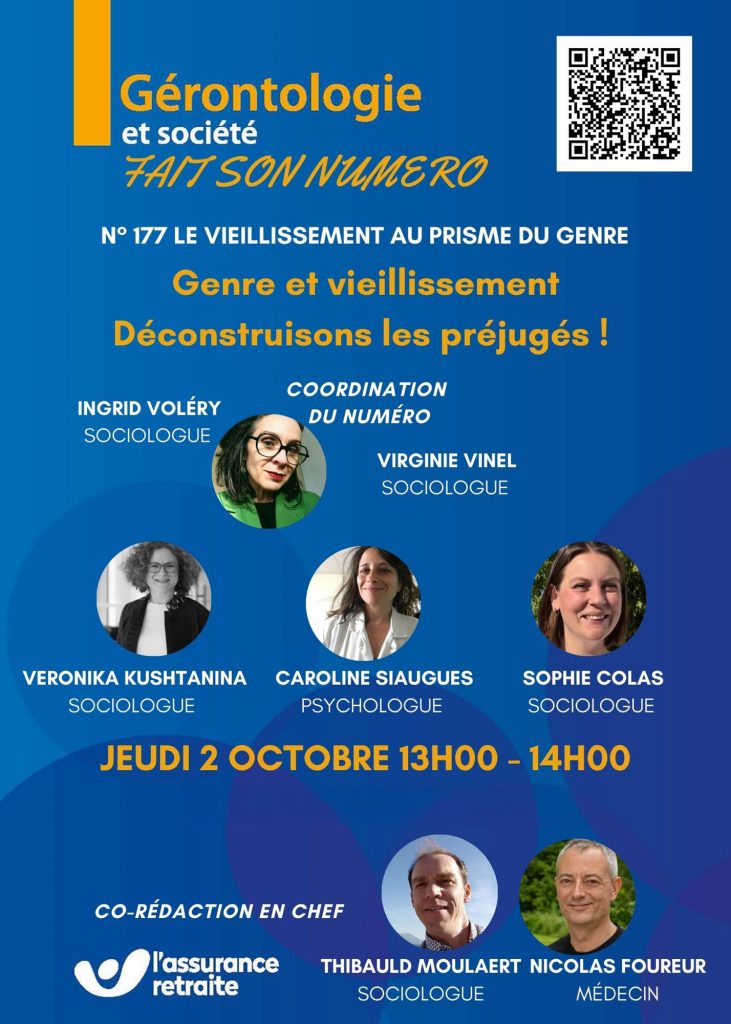 À l’occasion de la sortie du n°177 « Le vieillissement au prisme du genre » la revue organise un webinaire le jeudi 2 octobre 2025, de 13 h à 14 h. Les rédacteurs en chef de la revue et les coordinatrices du numéro, Virginie Vinel et Ingrid Voléry, invitent plusieurs autrices à présenter leur article autour de la problématique suivante : Genre et vieillissement : déconstruisons les préjugés !
