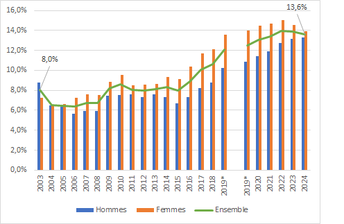 Parmi les nouveaux retraités de droit direct ayant une date d’effet en 2024, 13,6 % ont liquidé leur pension avec une décote (taux réduit). Les femmes sont plus souvent concernées avec une proportion de 13,9 %, contre 13,3 % pour les hommes.