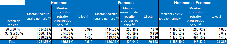 Au 31 décembre 2024, 31 368 retraités sont bénéficiaires d’une retraite progressive, soit une proportion de retraités de droit direct très faible (0,2 %). En 2024, 17 700 retraites progressives ont été attribuées.